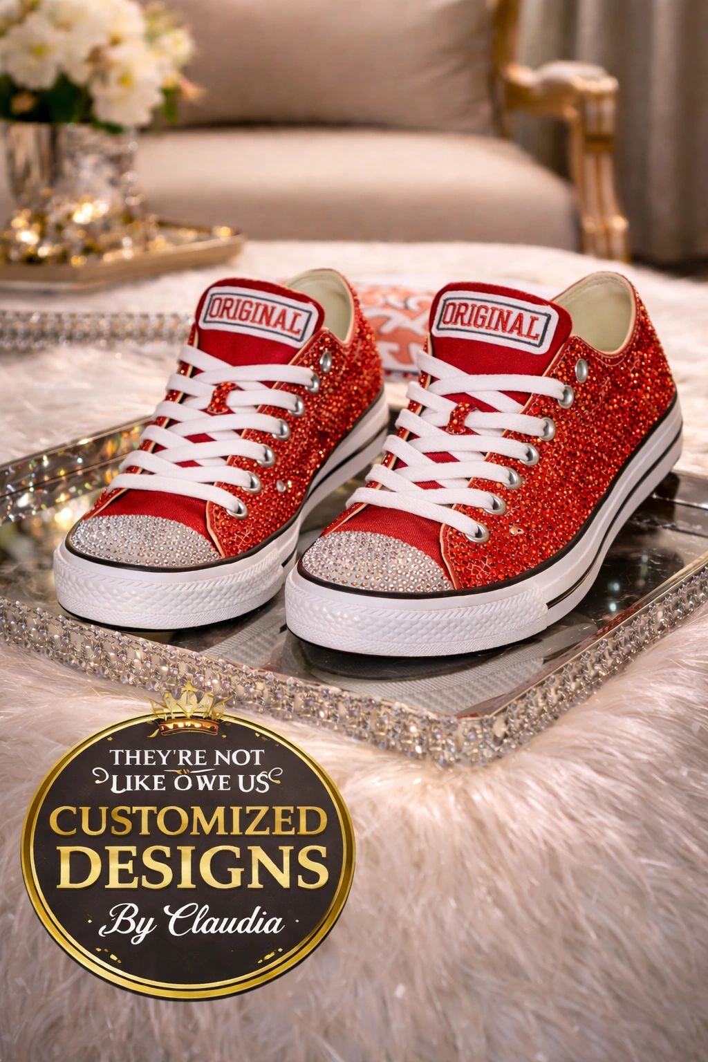 Her designs are inspired by pop culture, personal stories, and the belief that style should never be boring. What started as a fun hobby quickly turned into a movement, as Claudia’s custom creations began gaining attention for their originality, color, and attitude. Whether it's rhinestones, charms, or hand-painted details, every pair tells a story—and no two are ever the same.